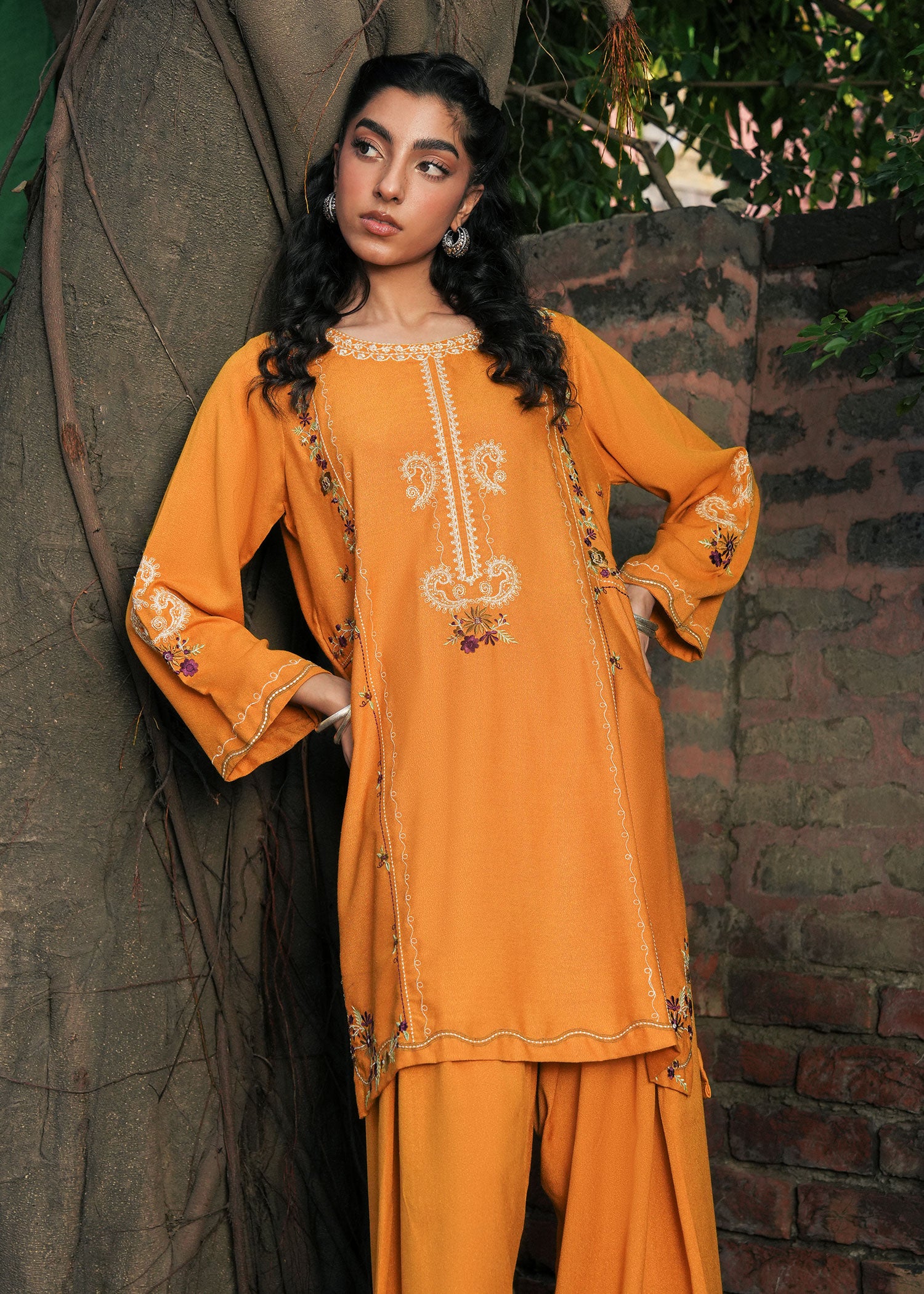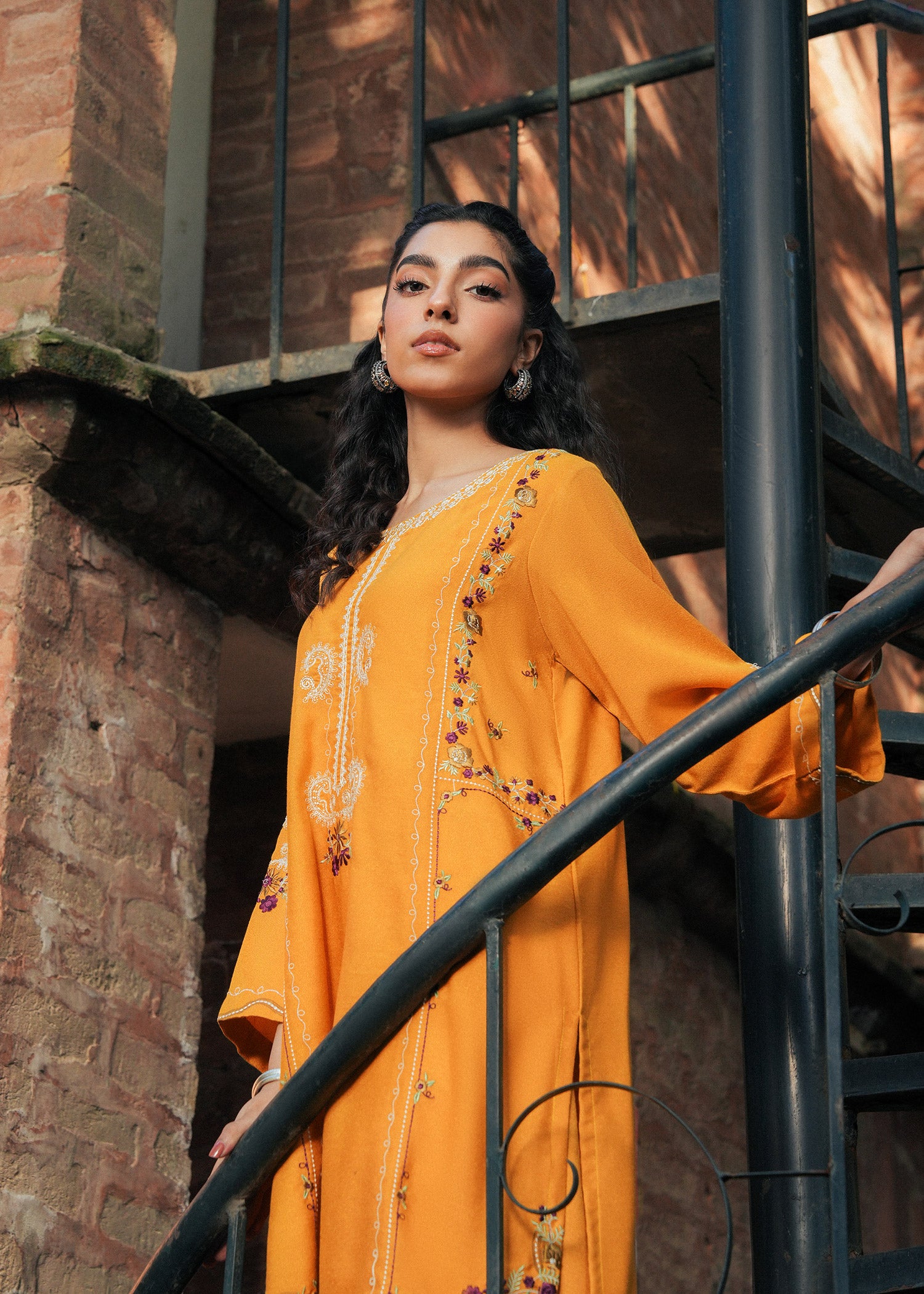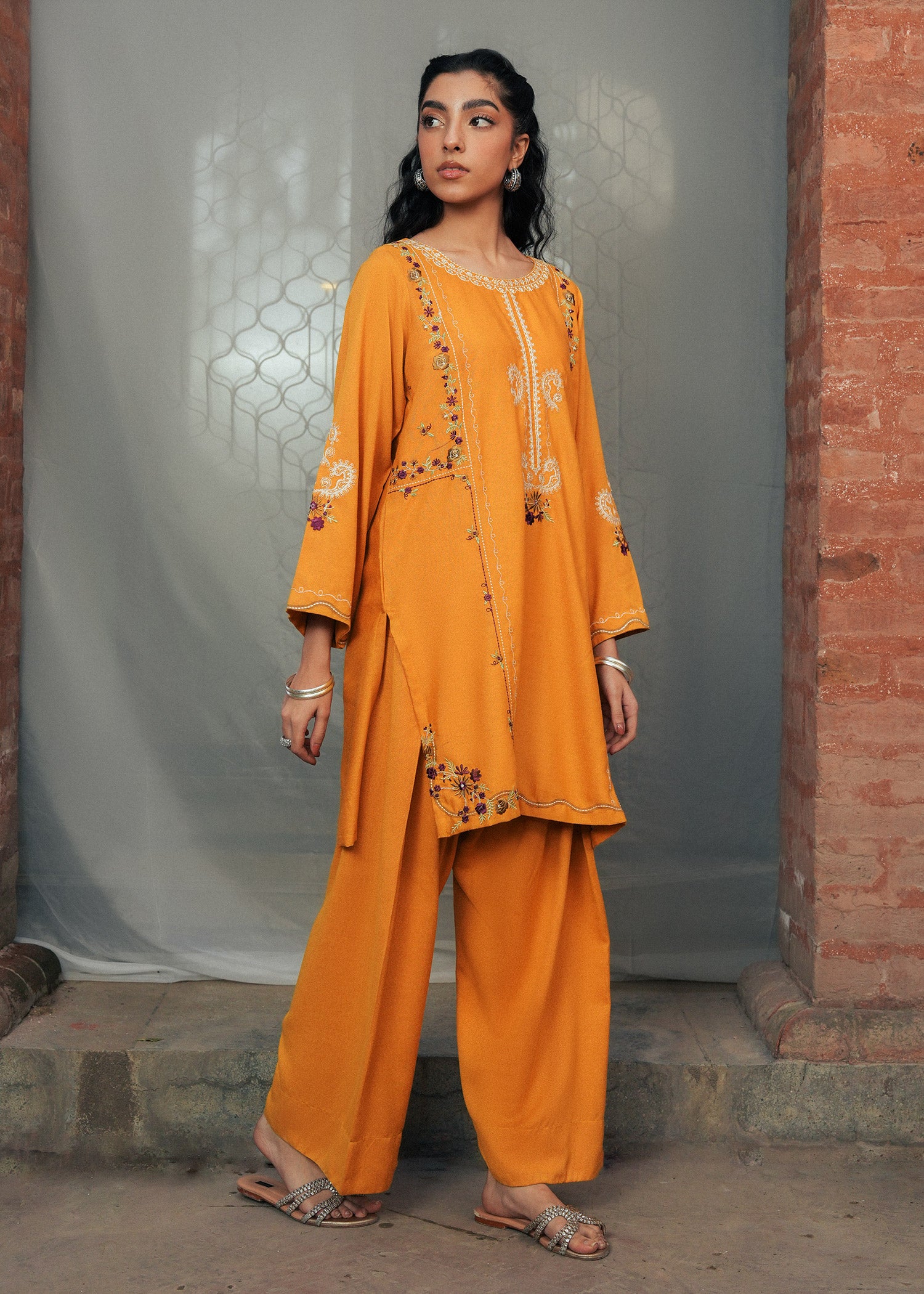 Description: Crafted from winter karandi in a soft yellow hue, this ensemble features an all-over embroidered shirt paired with matching trousers for a look that’s both bright and effortlessly refined.