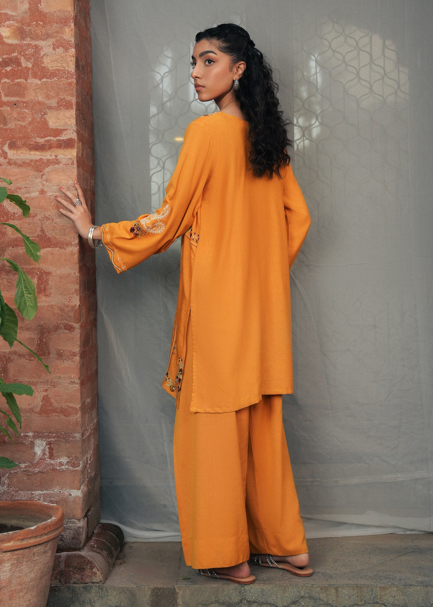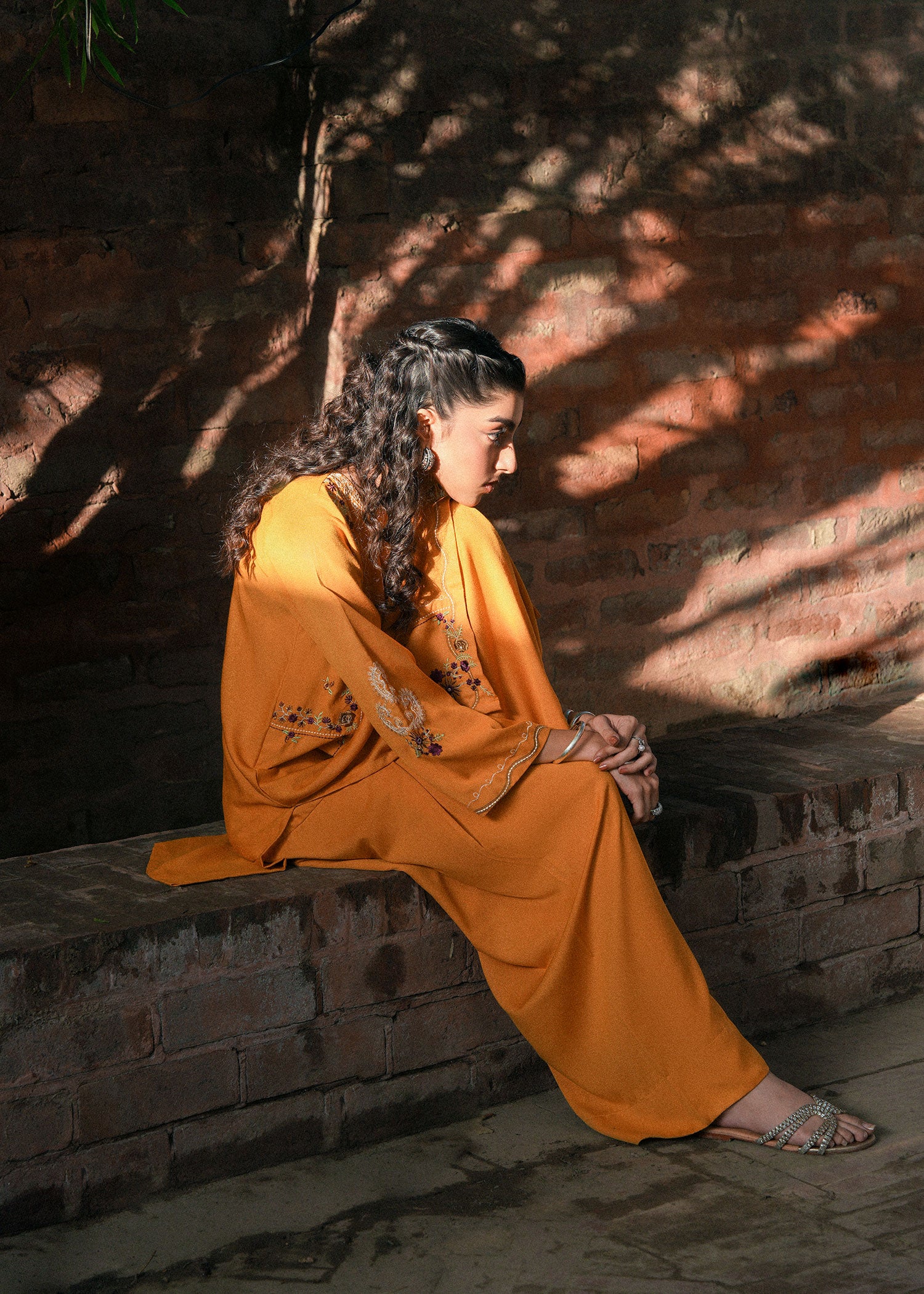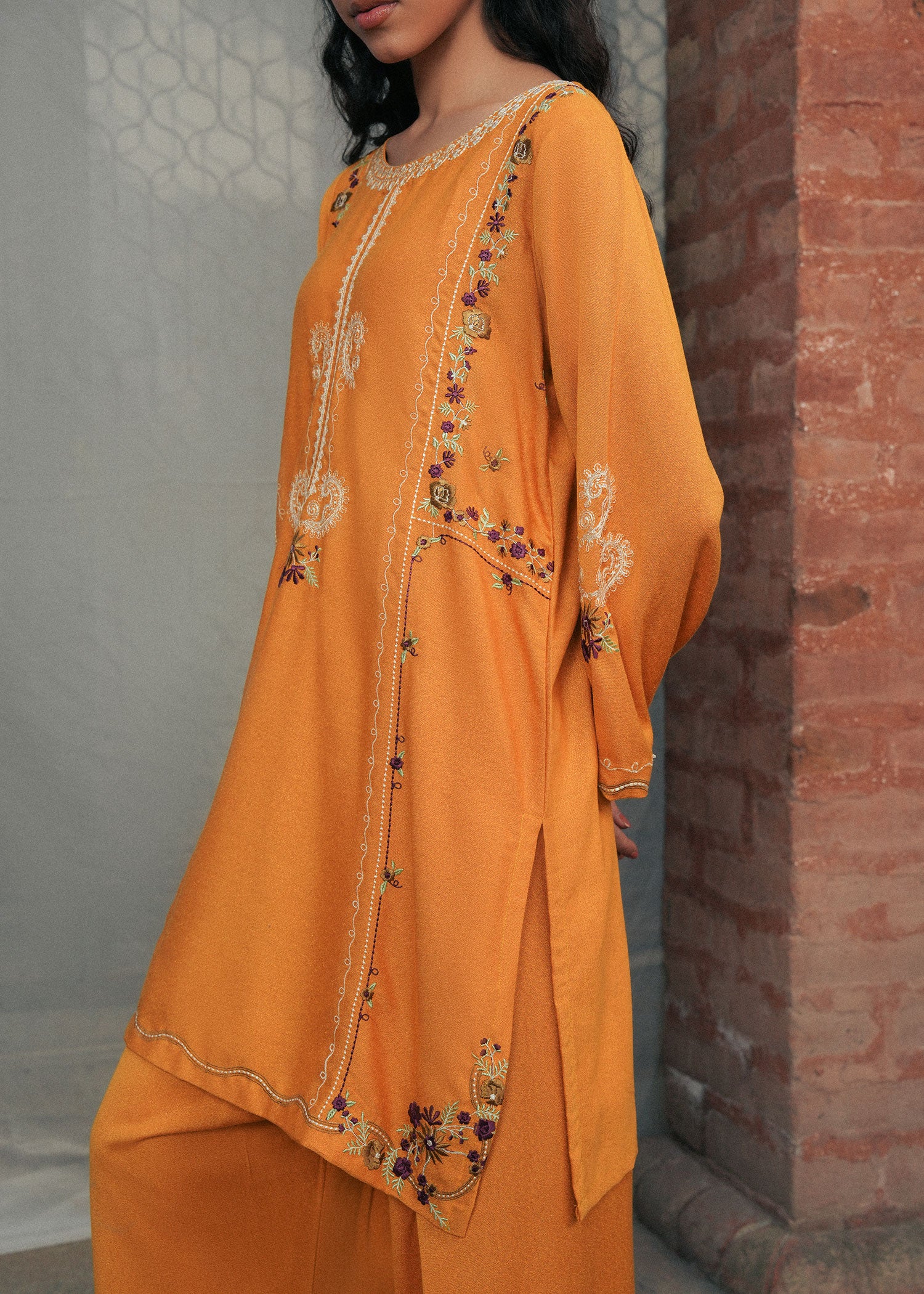 Description: Crafted from winter karandi in a soft yellow hue, this ensemble features an all-over embroidered shirt paired with matching trousers for a look that’s both bright and effortlessly refined.